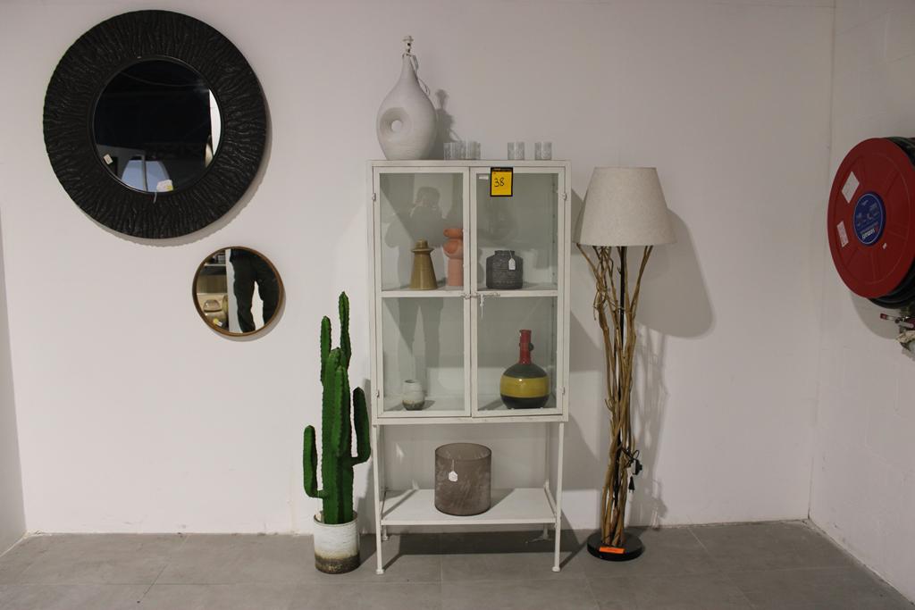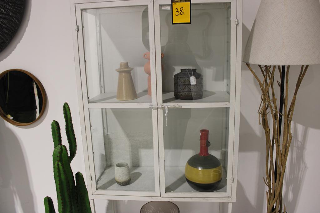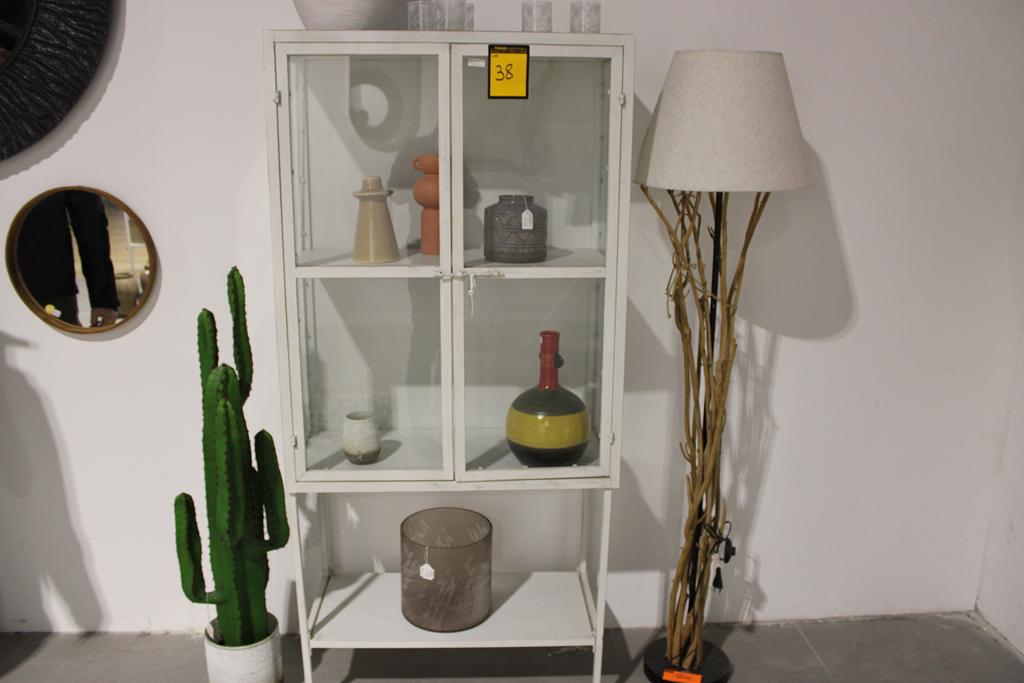 Lot 38: Armoire vitrée métal blanc + déco+ lampe sur pied