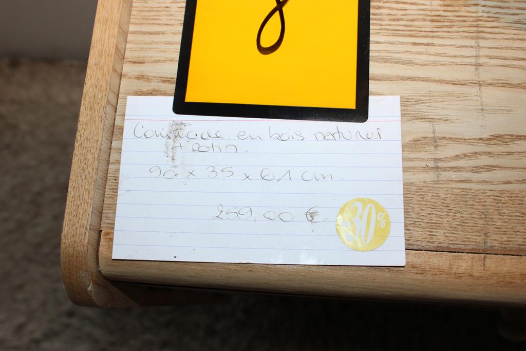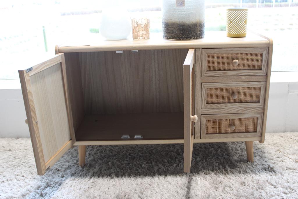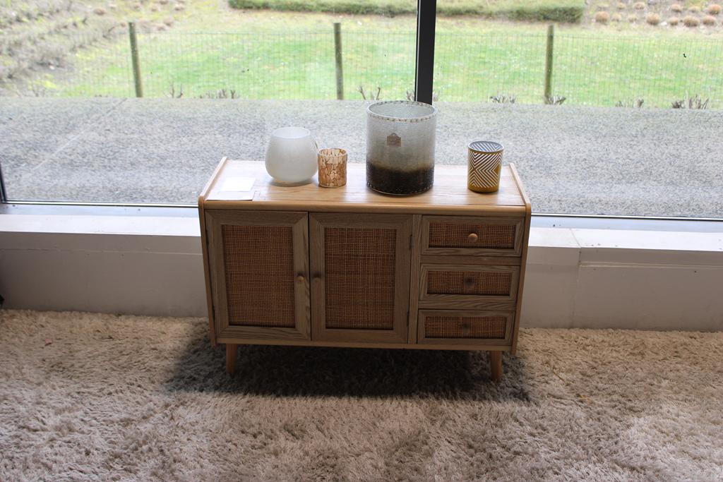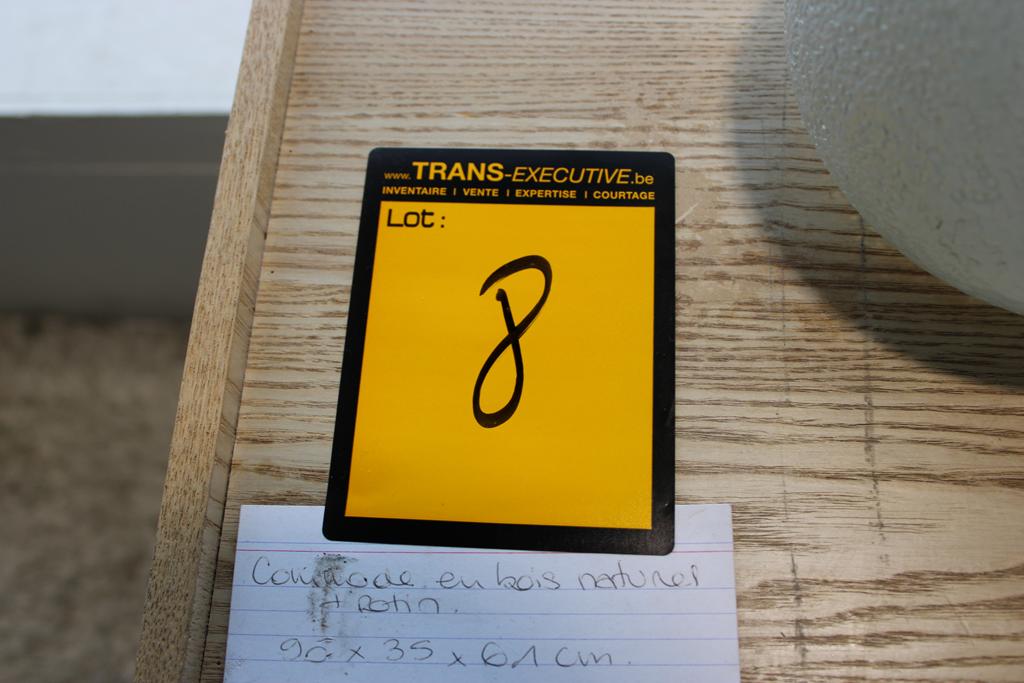Lot 8: Commode en bois naturel / rotin + décos
